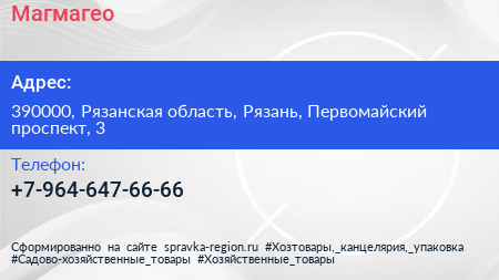 Магмагео по адресу 390000, Рязанская область, Рязань, Первомайский проспект, 3 в дальнейшем Организация, размещена в следующих категориях: