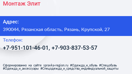 Монтаж Элит по адресу 390044, Рязанская область, Рязань, Крупской, 27 в дальнейшем Организация, размещена в следующих категориях: