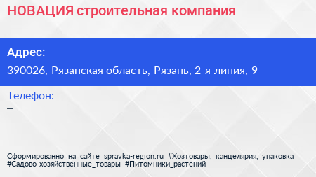 НОВАЦИЯ, строительная компания по адресу 390026, Рязанская область, Рязань, 2-я линия, 9 в дальнейшем Организация, размещена в следующих категориях: