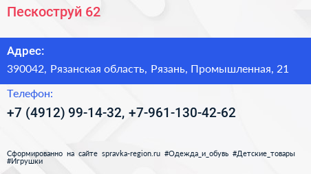 Пескоструй 62 по адресу 390042, Рязанская область, Рязань, Промышленная, 21 в дальнейшем Организация, размещена в следующих категориях: