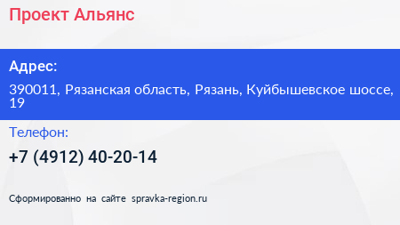 Проект Альянс по адресу 390011, Рязанская область, Рязань, Куйбышевское шоссе, 19 в дальнейшем Организация, размещена в следующих категориях: