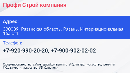 Профи Строй, компания по адресу 390039, Рязанская область, Рязань, Интернациональная, 16а ст1 в дальнейшем Организация, размещена в следующих категориях: