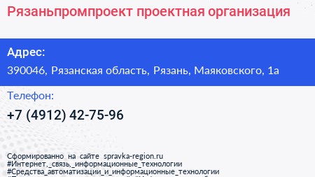 Рязаньпромпроект, проектная организация по адресу 390046, Рязанская область, Рязань, Маяковского, 1а в дальнейшем Организация, размещена в следующих категориях: