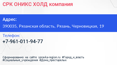 СРК ОНИКС ХОЛД, компания по адресу 390035, Рязанская область, Рязань, Черновицкая, 19 в дальнейшем Организация, размещена в следующих категориях: