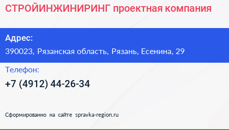 СТРОЙИНЖИНИРИНГ, проектная компания по адресу 390023, Рязанская область, Рязань, Есенина, 29 в дальнейшем Организация, размещена в следующих категориях: