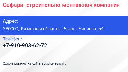 Сафари+, строительно-монтажная компания по адресу 390000, Рязанская область, Рязань, Чапаева, 64 в дальнейшем Организация, размещена в следующих категориях: