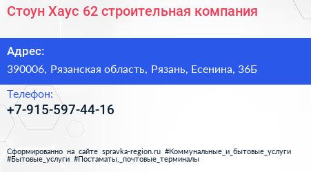Стоун Хаус 62, строительная компания по адресу 390006, Рязанская область, Рязань, Есенина, 36Б в дальнейшем Организация, размещена в следующих категориях: