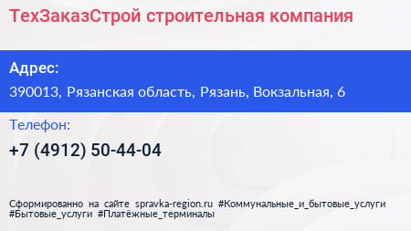 ТехЗаказСтрой, строительная компания по адресу 390013, Рязанская область, Рязань, Вокзальная, 6 в дальнейшем Организация, размещена в следующих категориях: