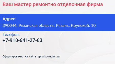 Ваш мастер, ремонтно-отделочная фирма по адресу 390044, Рязанская область, Рязань, Крупской, 10 в дальнейшем Организация, размещена в следующих категориях: