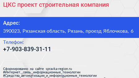 ЦКС-проект, строительная компания по адресу 390023, Рязанская область, Рязань, проезд Яблочкова, 6 в дальнейшем Организация, размещена в следующих категориях: