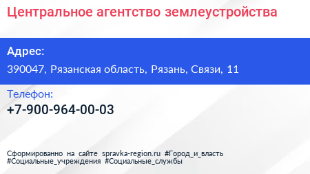 Центральное агентство землеустройства по адресу 390047, Рязанская область, Рязань, Связи, 11 в дальнейшем Организация, размещена в следующих категориях: