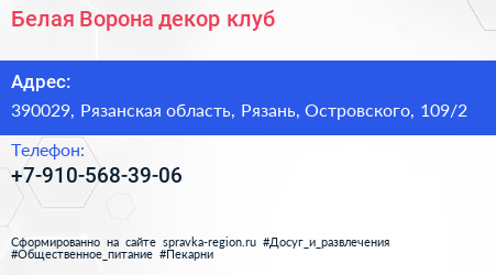 Белая Ворона, декор-клуб по адресу 390029, Рязанская область, Рязань, Островского, 109/2 в дальнейшем Организация, размещена в следующих категориях: