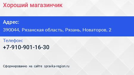 Хороший магазинчик по адресу 390044, Рязанская область, Рязань, Новаторов, 2 в дальнейшем Организация, размещена в следующих категориях: