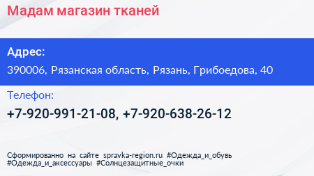 Мадам, магазин тканей по адресу 390006, Рязанская область, Рязань, Грибоедова, 40 в дальнейшем Организация, размещена в следующих категориях: