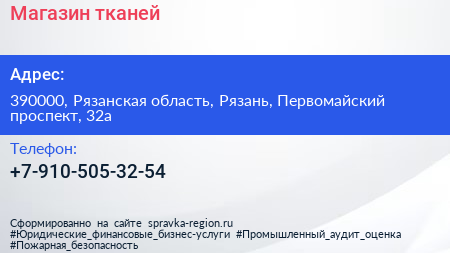 Магазин тканей по адресу 390000, Рязанская область, Рязань, Первомайский проспект, 32а в дальнейшем Организация, размещена в следующих категориях: