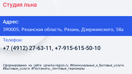 Студия льна по адресу 390005, Рязанская область, Рязань, Дзержинского, 58а в дальнейшем Организация, размещена в следующих категориях: