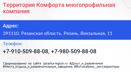 Территория Комфорта, многопрофильная компания по адресу 391110, Рязанская область, Рязань, Вокзальная, 11 в дальнейшем Организация, размещена в следующих категориях: