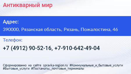 Антикварный мир по адресу 390000, Рязанская область, Рязань, Пожалостина, 46 в дальнейшем Организация, размещена в следующих категориях: