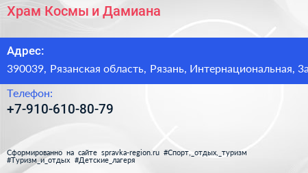 Храм Космы и Дамиана по адресу 390039, Рязанская область, Рязань, Интернациональная, 3а в дальнейшем Организация, размещена в следующих категориях: