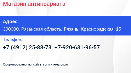 Магазин антиквариата по адресу 390000, Рязанская область, Рязань, Краснорядская, 15 в дальнейшем Организация, размещена в следующих категориях: