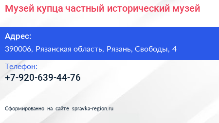 Музей купца, частный исторический музей по адресу 390006, Рязанская область, Рязань, Свободы, 4 в дальнейшем Организация, размещена в следующих категориях: