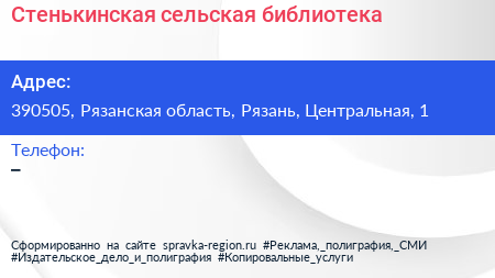 Стенькинская сельская библиотека по адресу 390505, Рязанская область, Рязань, Центральная, 1 в дальнейшем Организация, размещена в следующих категориях: