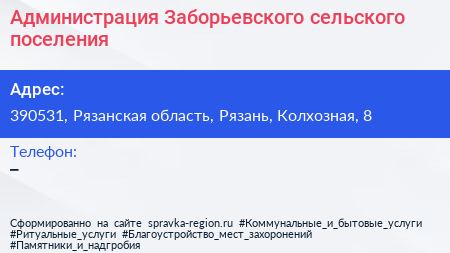 Администрация Заборьевского сельского поселения по адресу 390531, Рязанская область, Рязань, Колхозная, 8 в дальнейшем Организация, размещена в следующих категориях: