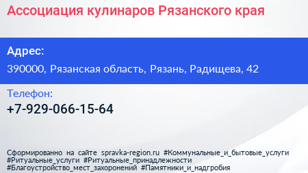 Ассоциация кулинаров Рязанского края по адресу 390000, Рязанская область, Рязань, Радищева, 42 в дальнейшем Организация, размещена в следующих категориях: