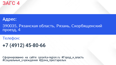 ЗАГС №4 по адресу 390035, Рязанская область, Рязань, Скорбященский проезд, 4 в дальнейшем Организация, размещена в следующих категориях: