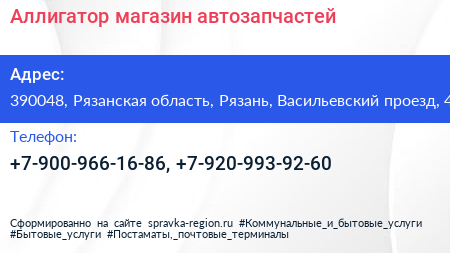 Аллигатор, магазин автозапчастей по адресу 390048, Рязанская область, Рязань, Васильевский проезд, 4 в дальнейшем Организация, размещена в следующих категориях: