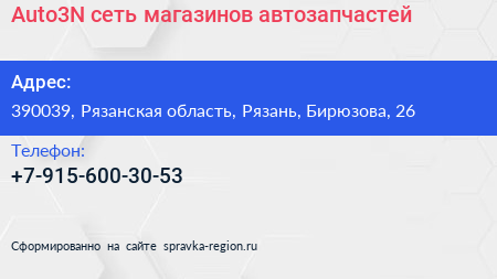 Auto3N, сеть магазинов автозапчастей по адресу 390039, Рязанская область, Рязань, Бирюзова, 26 в дальнейшем Организация, размещена в следующих категориях: