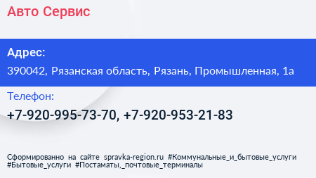 Авто Сервис по адресу 390042, Рязанская область, Рязань, Промышленная, 1а в дальнейшем Организация, размещена в следующих категориях: