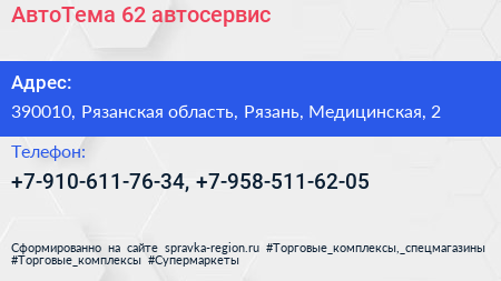 АвтоТема 62, автосервис по адресу 390010, Рязанская область, Рязань, Медицинская, 2 в дальнейшем Организация, размещена в следующих категориях: