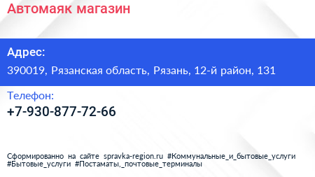 Автомаяк, магазин по адресу 390019, Рязанская область, Рязань, 12-й район, 131 в дальнейшем Организация, размещена в следующих категориях: