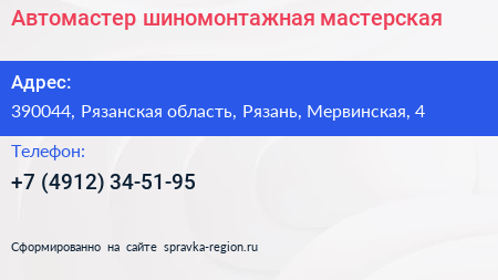 Автомастер, шиномонтажная мастерская по адресу 390044, Рязанская область, Рязань, Мервинская, 4 в дальнейшем Организация, размещена в следующих категориях: