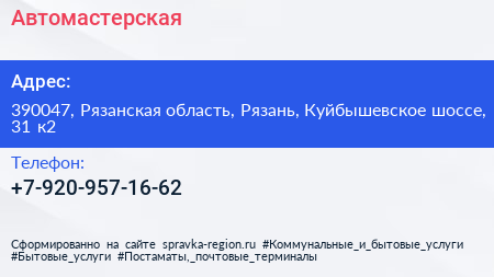 Автомастерская по адресу 390047, Рязанская область, Рязань, Куйбышевское шоссе, 31 к2 в дальнейшем Организация, размещена в следующих категориях: