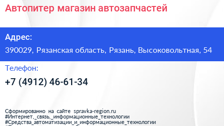 Автопитер, магазин автозапчастей по адресу 390029, Рязанская область, Рязань, Высоковольтная, 54 в дальнейшем Организация, размещена в следующих категориях: