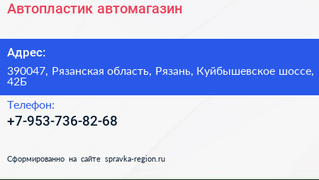 Автопластик, автомагазин по адресу 390047, Рязанская область, Рязань, Куйбышевское шоссе, 42Б в дальнейшем Организация, размещена в следующих категориях: