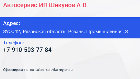 Автосервис, ИП Шикунов А. В. по адресу 390042, Рязанская область, Рязань, Промышленная, 3 в дальнейшем Организация, размещена в следующих категориях: