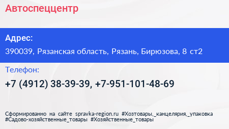 Автоспеццентр по адресу 390039, Рязанская область, Рязань, Бирюзова, 8 ст2 в дальнейшем Организация, размещена в следующих категориях: