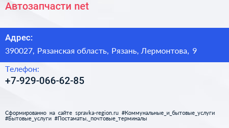 Автозапчасти.net по адресу 390027, Рязанская область, Рязань, Лермонтова, 9 в дальнейшем Организация, размещена в следующих категориях: