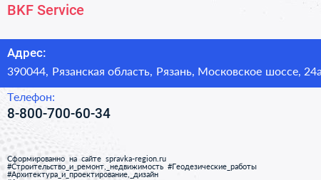 BKF Service по адресу 390044, Рязанская область, Рязань, Московское шоссе, 24а в дальнейшем Организация, размещена в следующих категориях: