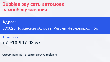 Bubbles bay, сеть автомоек самообслуживания по адресу 390025, Рязанская область, Рязань, Черновицкая, 56 в дальнейшем Организация, размещена в следующих категориях: