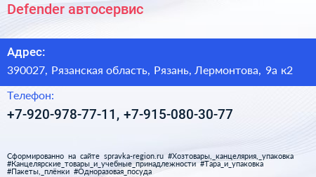 Defender, автосервис по адресу 390027, Рязанская область, Рязань, Лермонтова, 9а к2 в дальнейшем Организация, размещена в следующих категориях: