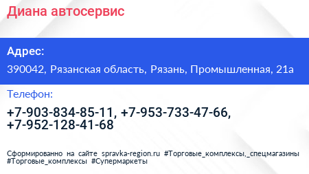 Диана, автосервис по адресу 390042, Рязанская область, Рязань, Промышленная, 21а в дальнейшем Организация, размещена в следующих категориях: