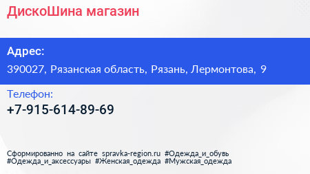 ДискоШина, магазин по адресу 390027, Рязанская область, Рязань, Лермонтова, 9 в дальнейшем Организация, размещена в следующих категориях: