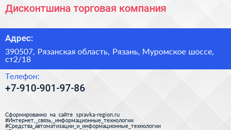 Дисконтшина, торговая компания по адресу 390507, Рязанская область, Рязань, Муромское шоссе, ст2/18 в дальнейшем Организация, размещена в следующих категориях: