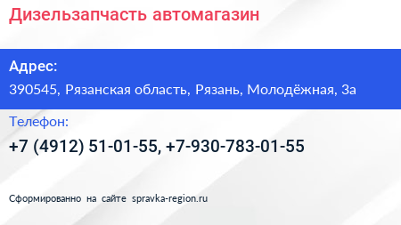 Дизельзапчасть, автомагазин по адресу 390545, Рязанская область, Рязань, Молодёжная, 3а в дальнейшем Организация, размещена в следующих категориях: