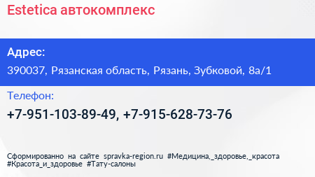 Estetica, автокомплекс по адресу 390037, Рязанская область, Рязань, Зубковой, 8а/1 в дальнейшем Организация, размещена в следующих категориях: