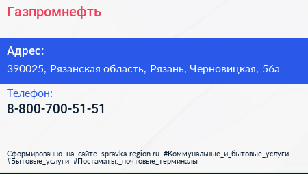 Газпромнефть по адресу 390025, Рязанская область, Рязань, Черновицкая, 56а в дальнейшем Организация, размещена в следующих категориях: